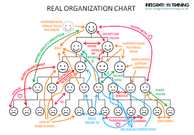 Lots going on, right? The underlying message is that, beneath the straightforward structure of a hierarchy is a rash of hidden relationships and power dynamics which go unseen, ostensibly because of the threats created by unequal power and the static rigidity of specialized work. There's a lot more going on than meets the eye, and thus possibly a lot of problems going unaddressed, festering under the surface. A lack of transparency, basically.